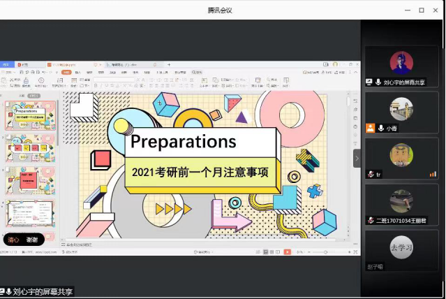 为进一步加强同学们对研究生入学考试的认识,帮助考研学生排解考前压力、充分做好考前准备,工业设计系于2020年11月22日19时通过腾讯会议线上举办了考研分享会:学长学姐传帮带,给学弟学妹考研助力。工业设计系毕业年级辅导员李小青、2016级学姐邱陈冬月、姚复怡、胡释予、张丹芮和学长刘心宇以及2017级考研学生参加了此次线上考研分享会。