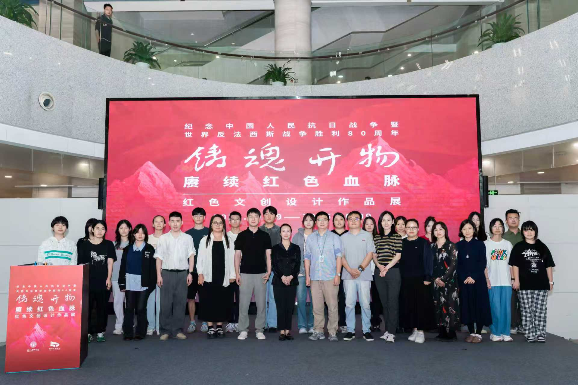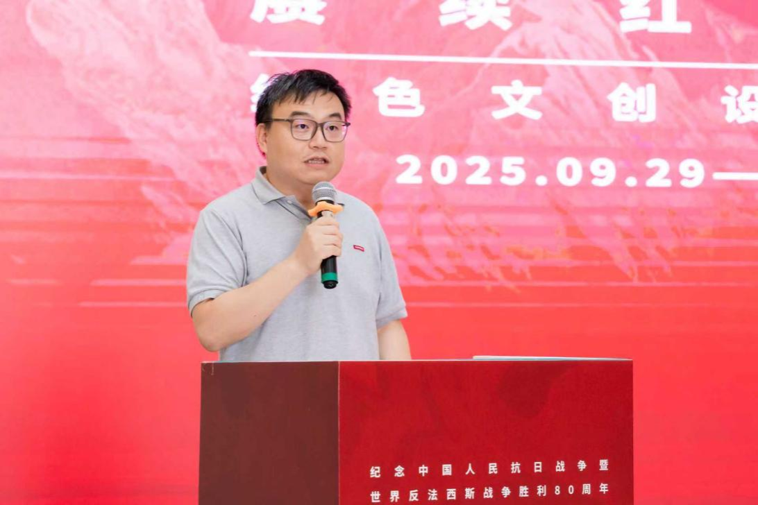 开幕式上,赵飞代表指导教师发言,本次展览围绕“铸魂开物”主题,从设计的本质出发,阐述了红色文创设计的精神内核与实践路径,深入挖掘红色精神的当代价值,实现从“叙事”到“转译”、从“再现”到“再生”、从“符号”到“融入”的转化,让红色文化真正融入日常生活,实现精神赓续。同时鼓励青年学子以设计为媒介,传承红色基因,展现文化自信与创新活力。