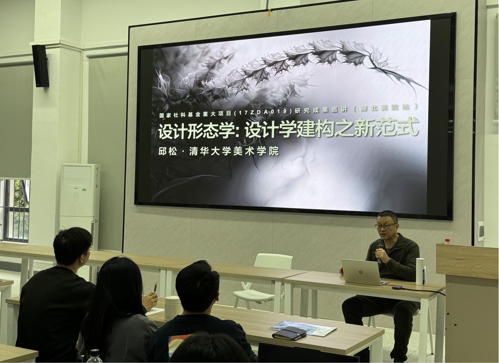 邱松教授从设计形态学的定义切入主题,结合自身多年的从教经验与实践案例,生动的为同学们诠释了设计形态学的研究方向与课题广度,并解释了何为“万物皆具天性,明其理方能悟其道;世事尽现因缘,晓其始亦可得其终”。指出在深入了解工业设计领域的核心知识点后应积极涉足获取其他学科相关知识,通过拓宽研究广度进而驱使带动研究深度。
