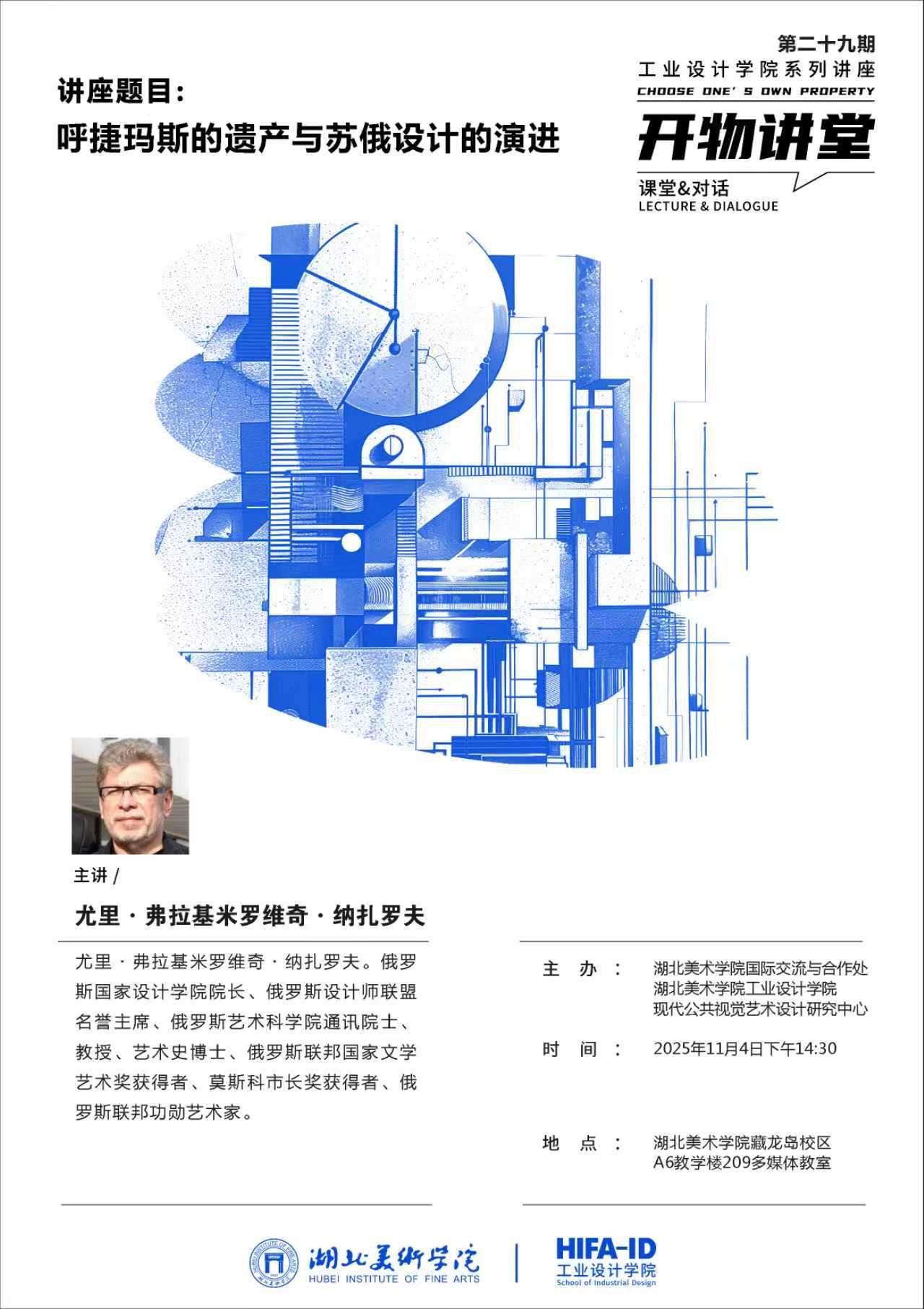 11月4日下午,在A6教学楼209报告厅,俄罗斯国家设计学院院长尤里•弗拉基米罗维奇•纳扎罗夫教授为学院师生带来“开物讲堂”第二十九期《呼捷玛斯的遗产与苏俄设计的演进》学术讲座。学院青年教师代表及学生参加了本次活动,讲座由院长助理王康主持。