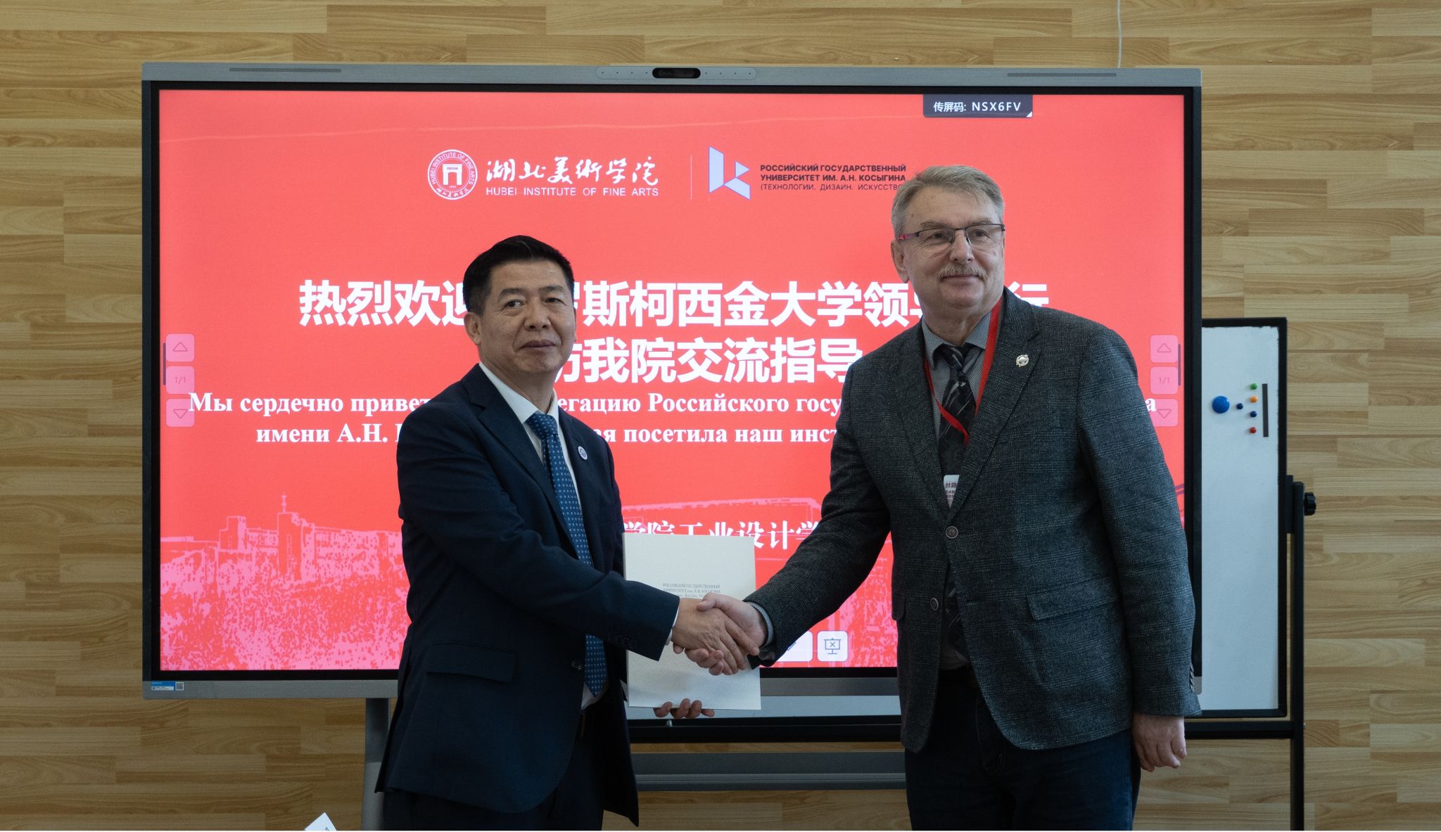 交流过程中,双方举行了教授互聘仪式。湖北美术学院聘请俄罗斯国立柯西金大学杰姆比茨基·谢尔盖·根纳季耶维奇校长、纳扎罗夫·尤里·弗拉基米拉维奇教授担任特聘教授。俄罗斯国立柯西金大学则聘请程智力校长、杨艺副院长担任该校科研博士生导师,互聘仪式为双方人才联合培养奠定坚实基础。俄罗斯国立柯西金大学代表团向学校赠送具有俄罗斯民族工艺特色的工艺品,以祝贺湖北美术学院105周年校庆活动圆满成功。学校回赠了百年校庆系列文创产品,以作纪念。最后,程智力校长与杰姆比茨基·谢尔盖·根纳季耶维奇校长共同为“工业设计创新研究中心”揭牌。