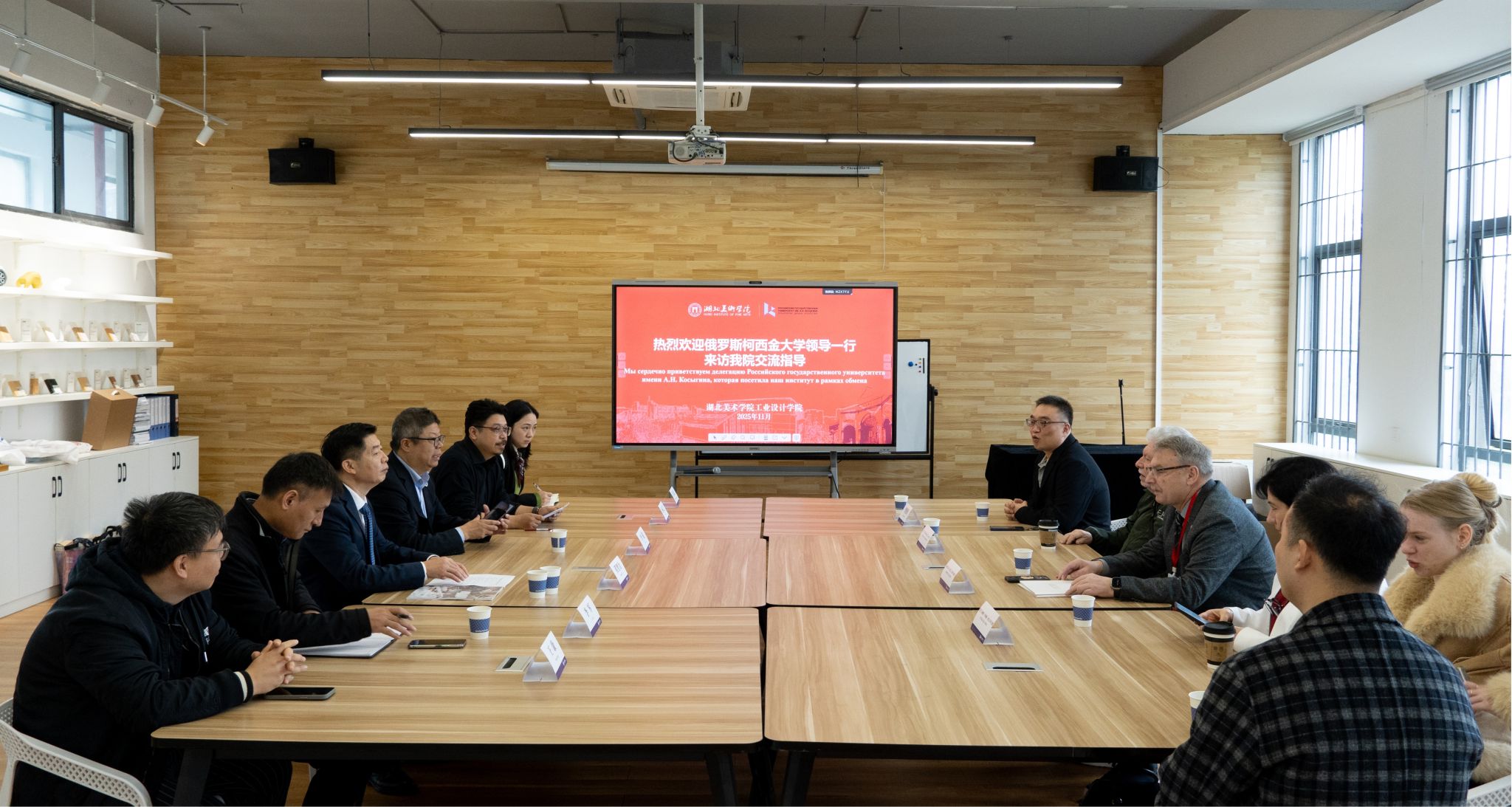 俄罗斯国立柯西金大学第一副校长、俄罗斯联邦教育系统荣誉工作者杰姆比茨基·谢尔盖·根纳季耶维奇教授,俄罗斯国家设计学院院长、俄罗斯艺术科学院荣誉院士、俄罗斯设计师联盟名誉主席、俄罗斯国立柯西金大学纳扎罗夫·尤里·弗拉基米拉维奇教授,装饰应用艺术教研室系主任蕾巴乌琳娜·伊琳娜·维克多萝芙娜教授,中国外事办主任专家曹晓明与湖北美术学院党委常委、副校长程智力出席活动,国际交流与合作处处长李锐、工业设计学院党委书记李军、副院长杨艺、院长助理王康、院长助理黄双君及教师代表邱棋、黄帆参加活动。活动由工业设计学院副院长杨艺主持。