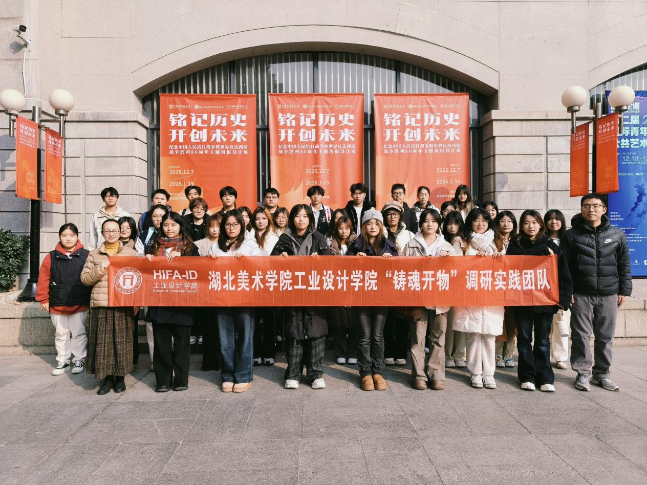 近日,“铭记历史 开创未来——纪念中国人民抗日战争暨世界反法西斯战争胜利80周年主题海报设计展”在湖北美术学院美术馆开幕。12月17日上午,工业设计学院党委副书记赖慧蓉、辅导员李洋带领“铸魂开物”调研实践团成员及新生代表共计40余人前去参观,开展一场生动的爱国主义教育与专业学习相结合的实践活动。