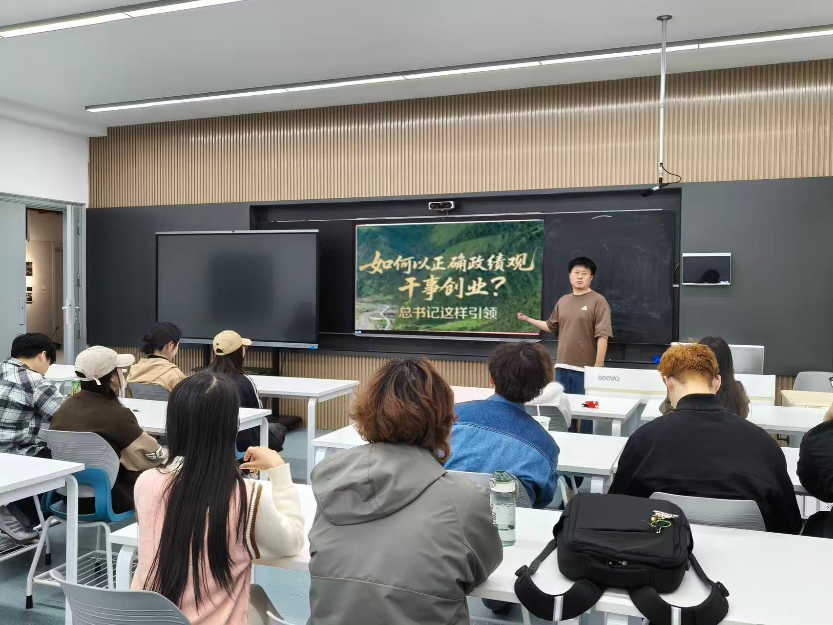 丁晖围绕《习近平关于树立和践行正确政绩观论述摘编》第二篇、第三篇内容进行分享和讲解,文中主要说明了政绩为谁而树的根本问题,深刻阐述为民造福是最重要的政绩,强调必须坚持以人民为中心,把群众安危冷暖放在心上,以人民满意不满意、高兴不高兴、答应不答应作为衡量政绩的根本尺度,创造经得起实践、人民和历史检验的实绩。他表示,我们全体党员要把正确政绩观融入专业学习、志愿服务与社会实践中去,重实干、求实效、讲奉献,以青春实绩践行初心使命。