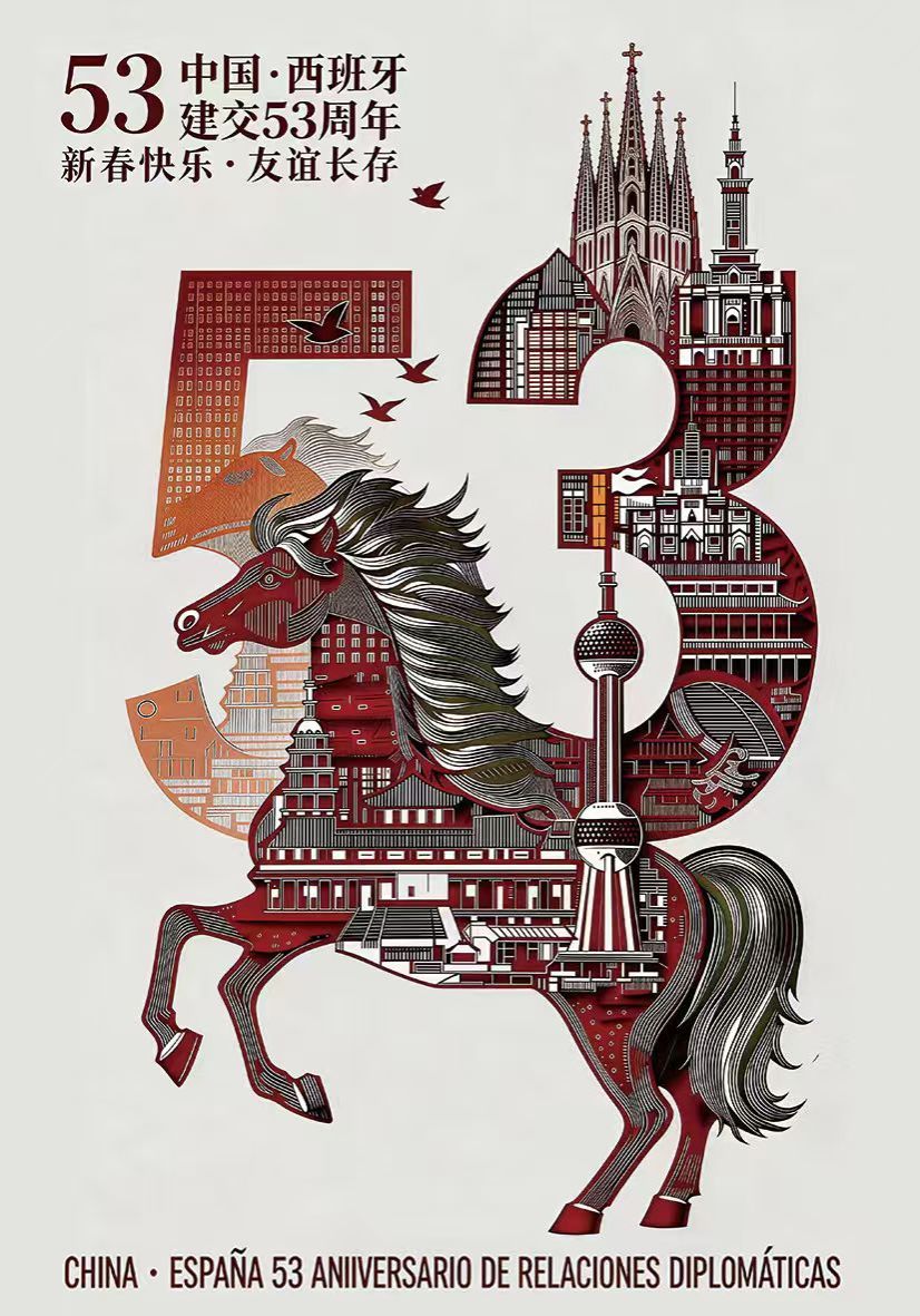 设计作品《中国·西班牙建交五十三周年》以数字“53”为骨架,将奔腾骏马与中西标志性建筑——圣家堂、东方明珠、中式楼阁等巧妙融合,用现代设计语言串联起两国文化脉络。